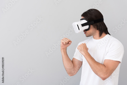 man, brave, box, fist, virtual, reality, device, always, connected, isolated, grey, background, wireless, photogenic, goggles, modern, use, emotion, tech, pleasant, progress, single, startup, casual attire, development, life, caucasian, innovation, person, male, wearable, technology, daytime, racked, mood, future, hand, indoor, manhood, digital, sport, lifestyle, contemporary, user, inside