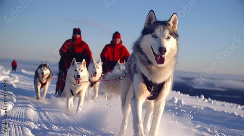 Brave Mushers Driving Sled Dog Team Through a Picturesque Snowy Landscape on a Sunny Day.