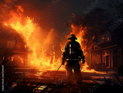 Bravery in Action: Firefighter Battling House Fire - Perfect for Emergency Services, Fire Safety Campaigns, and Heroic Acts