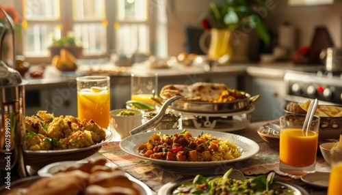 breakfast table with Indian food, healthy diet, smart kitchen background, closeup picture, panaromic, representing healthy lifestyle