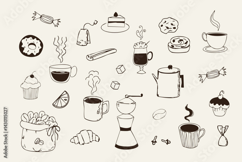 Breakfast tea and coffee sketch retro hand drawn cafe menu elements. Vintage dessert whimsical doodle drawing, Croissant and morning coffee mug, cappuccino beverage.