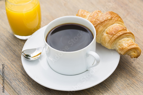 breakfast, hot drink, croissant, juice, espresso, morning, bake, bakery, beverage, black, break, bun, cafes, caffeine, croissant, cookery, cup, delicious, drink, eating, food, french, heat, hot, object, orange, pastry, snack, sugar, table, white, wooden