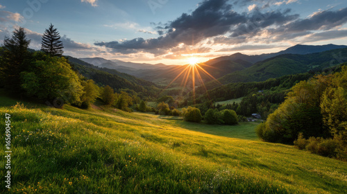 Breathtaking landscape featuring rolling hills, lush green grass, and vibrant sunset illuminating sky. scene evokes tranquility and natural beauty, perfect for outdoor enthusiasts