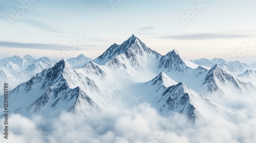 Breathtaking mountain range emerging through soft clouds, showcasing the beauty of nature in a serene and tranquil setting.
