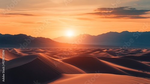 Breathtaking panoramic view of a desert at sunset, with vibrant orange skies casting shadows over sand dunes and rugged mountains.