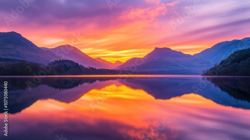 Breathtaking sunset over a tranquil mountain lake reflecting vibrant colors in the sky at dusk