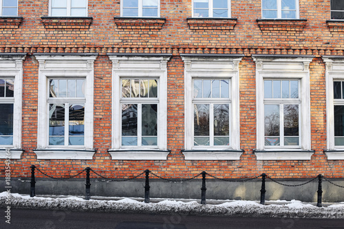 Brick building facade with windows in winter. Urban architecture exterior with red bricks and snow on ground. Classic residential house front. City street background during cold season.