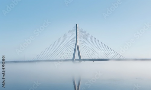 bridge, fog, water, mist, suspension, cable, sky, blue, calm, still, morning, grey, white, modern, architecture, structure, design, steel, concrete, horizontal, line, geometric, abstract, minimal, landscape, nature, urban, city, empty, solitude, peaceful, tranquil, serene, atmospheric, dreamy