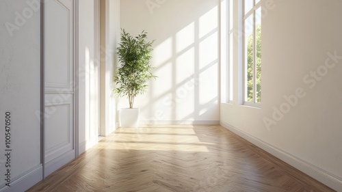 Bright and airy hallway showcasing natural light, wooden flooring, and a potted plant, perfect for modern interior decor.
