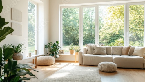Bright and airy living room with large windows, cozy sofa, and indoor plants, creating a serene and inviting atmosphere.