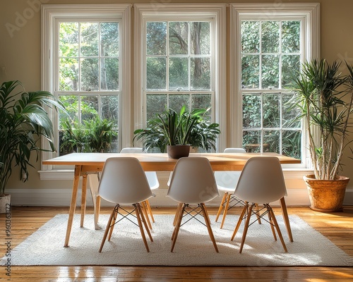 Bright and Airy Scandinavian Modern Dining Room with Light Wood Table and White Chairs