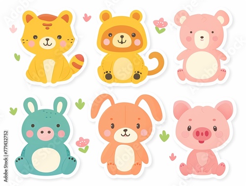 Bright and cheerful paper sticker set, including a kitten, bunny, bear, pig, and frog, designed to beautify checklists, cards, and notepad sheets, in a cute, flat design illustration, minimalis