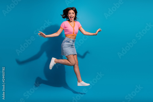 Bright and cheerful young woman jumping in casual summer outfit on vibrant blue background