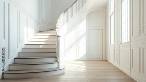 Bright and clean interior of staircase with natural light streaming in, showcasing elegant design and closed door. serene and inviting atmosphere is created