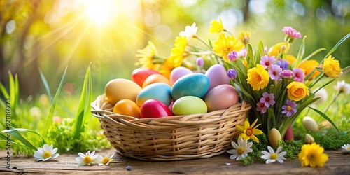 Bright and colorful Easter eggs in a basket surrounded by spring flowers, Easter, holiday, celebration, spring, colorful, eggs