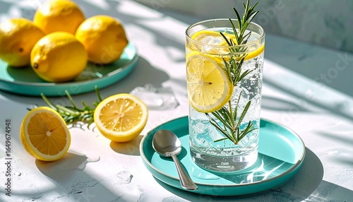 Bright and Invigorating Lemon Water with Fresh Rosemary Sprigs, Perfect for Hydration and Wellness on a Sunny Day.