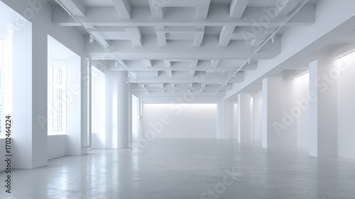 bright, minimalist, white, loft, interior, concrete, ceiling, beam, creative, space, empty, room, architecture, modern, design, floor, light, industrial, style, nobody, window, column, urban, structure, building, perspective, background, gallery, showroom, studio, workspace, blank, clean, open, business, rental, real, estate, property, commercial, available