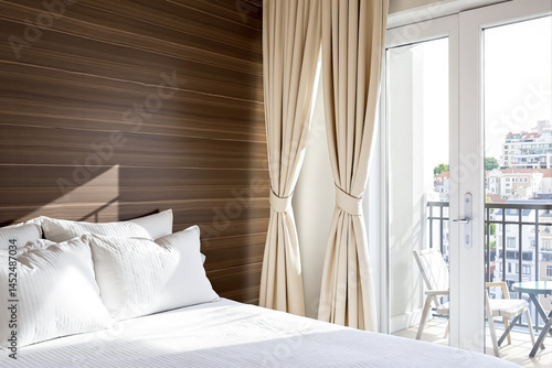 bed, bedchamber, curtain, pillow, white, bedding, wood, paneling, sunlight, sheer, beige, neutral, serene, inviting, crisp, clean, bright, airy, calm, peaceful, relaxing, restful, comfort, luxury, hotel, room, interior, decor, home, apartment, balcony, view, city, modern, minimal, stylish, elegant, window, door, furniture, space