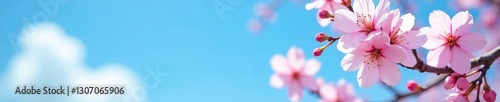 Bright blue sky with delicate cherry blossom flowers, spring, petals