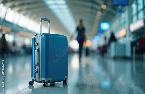 suitcase, baggage, travel, aerodrome, terminal, journey, vacation, trip, departure, arrival, passenger, traveler, transport, bag, holiday, business, tour tourism, destination, mobility, international, gate, waiting, wheel, interior, bright, modern, blurred, background, floor, hall, lounge, platform, station, hub, aerodrome, freedom, adventure, exploration, discovery, wanderlust, lifestyle, global, transit, planning, logistic, blue, empty, ready, new
