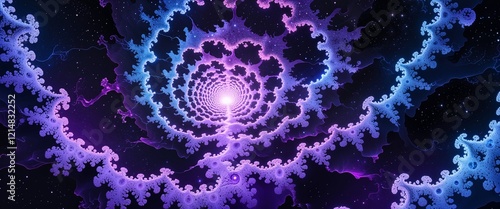 Bright cyan fractal shapes expanding in a dark starry void with hints of purple light illustration background design