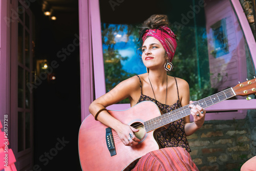 Bright earrings. Beautiful dark-haired woman wearing bright earrings playing on guitar outside cafe