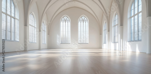 Bright, expansive room features white walls and arched windows that fill the space with natural light, creating a serene atmosphere