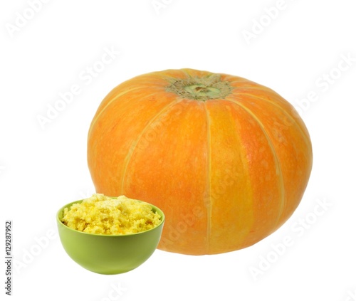 vegetable, healthy, fresh, vegetarian, pumpkin, orange, white, background, marrow, food, meal, garden, gardening, halloween, symbol, diet, slice, strip, isolated, closeup, macro, colours, alone, big, heavy, weight, porridge, millet, cooked, prepared, filling, stuffing, cut, piece, small, steamed, milk, ingredient, melted, poured, spiced, bowl, dish, ceramic, container, green, deep, full