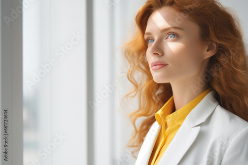 bright, light, high key, businesswoman, successful, confident, young, beautiful, relax, happy, confidence, entrepreneur, corporate, businessperson, brightness, suit, white, businesswoman, businessperson, business, woman, blond, yellow, orange, curly hair, people, business suit, concept, space, design, communication, connection, spotlight, caucasian, her, modern, professional, businesswoman, lady, female, girl, senior, portrait, mature, work, career, person