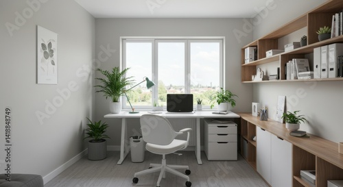 home, office, desk, workspace, modern, minimalist, white, wood, plant, shelf, organisation, clean, bright, window, view, interior, design, decor, room, furniture, chair, computer, lighting, simple, calm, peaceful, serene, productive, efficient, stylish, contemporary, aesthetic, light, airy, roomy, comfortable, functional, neat, tidy, organised, work, study, creative