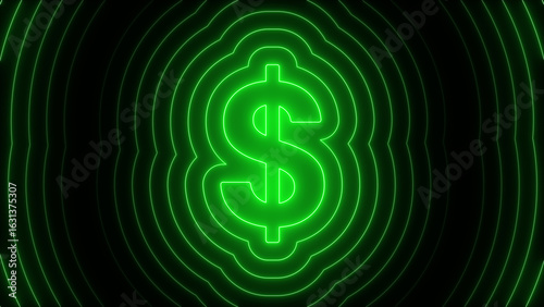 Bright Neon Green Dollar Symbol with Futuristic Concentric Shapes on Black Background. Vibrant Finance, Money, Banking, Economy, and Cryptocurrency Abstract Concept Art