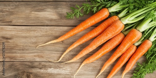 Bright orange carrots with leafy greens rest on a wooden table, showcasing their vibrant color and natural texture under soft lighting