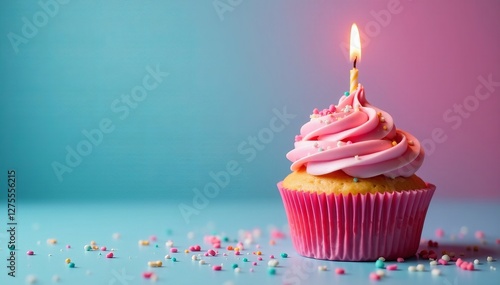 Bright pink birthday cupcake with lit candle and sprinkles, treat, cupcake