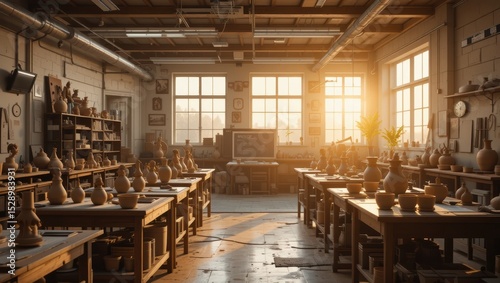Bright Pottery Studio Filled with Ceramic Vessels and Natural Light During Sunset