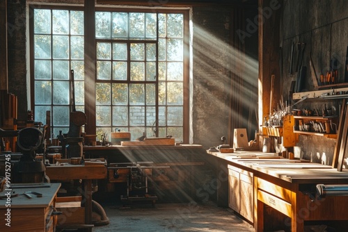 Bright rays of sunlight stream through a dusty workshop window. This cozy space invites creativity and craftsmanship. A perfect blend of industry and warmth. Generative AI