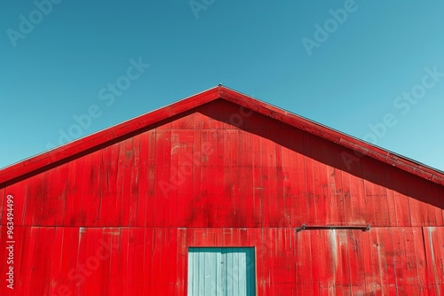 barn, red, blue, sky, rural, country, farm, agriculture, building, wood, wooden, door, turquoise, vibrant, colourful, contrast, peaceful, serene, landscape, nature, countryside, summer, sunny, day, exterior, nobody, minimalism, simple, geometric, architectural, traditional, life