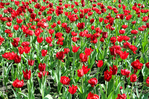 Bright red flowers of tulips blooming in a garden on a sunny spring day with natural lit by sunlight. Beautiful fresh nature floral pattern.