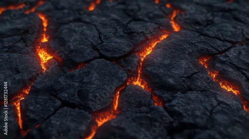 Bright red lava shines through dark cracks in the rocky surface, showcasing the powerful force of nature in a volcanic region during the night. The contrast creates a mesmerizing spectacle