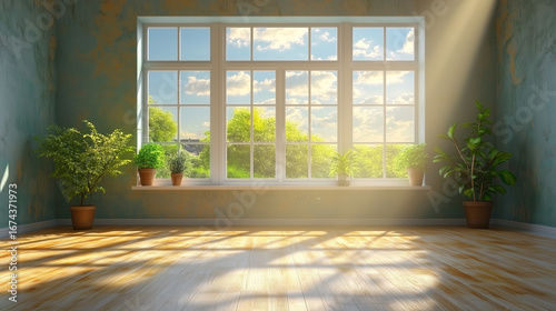 sunlight, room, window, plant, floor, shadow, wooden, bright, empty, light, pot, green, tree, sky, cloud, nature, interior, indoor, space, wall, pane, frame, view, exterior, day, warm, natural, beam, ray, shine, illumination, surface, texture, foliage, leaf, garden, house, home, residence, growth, clear, landscape, contrast, pattern