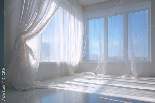 Bright Sunlight Filters Through Sheer Curtains in a Modern, Airy Living Space During the Day