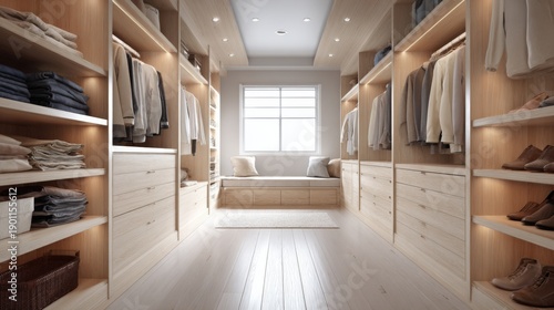 closet, clothes rack, interior, storage, shelf, wood, wooden, furniture, design, modern, minimalist, luxury, home, room, dressing, organisation, cabinet, drawer, lighting, led, warm, clean, elegant, lifestyle, architecture, apartment, house, floor, window, sunlight, neutral, beige, tidy, space, contemporary, custom, built