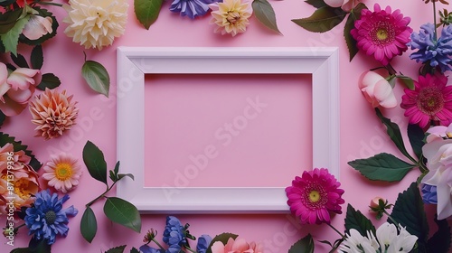 Bright white frame decorated with colorful flowers on a pink background