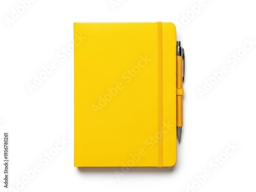 notebook, yellow, pen, attached, design, bright, white, background, closed, sleek, vibrant, practical, organisation, preparedness