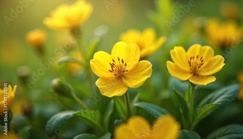 Bright yellow small flowers bloom in sunny garden. Green foliage surrounds vibrant blossoms. Delicate petals, prominent stamens. Wild flora natural scene captures summer beauty, growth, fresh bloom