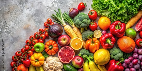 Brightly colored juicy fruits and vegetables arranged artfully on a neutral background, arrangement, still life