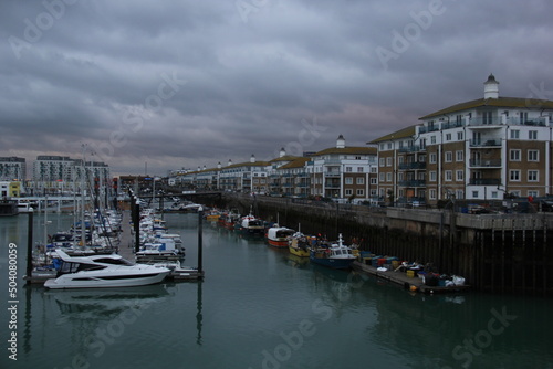 Brighton Marina during a cloudy sunset. Moored ships on the water.