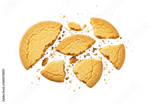 cookie, biscuit, food, snack, sweet, dessert, baked, sugar, flour, butter, delicious, tasty, crunchy, crispy, round, circle, broken, cracked, piece, fragment, crumb, scattered, top, view, overhead, copy, space, center, empty, plain