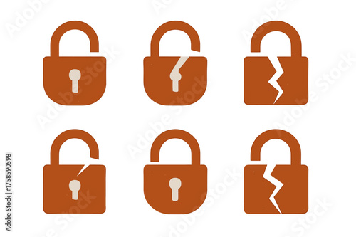 broken, padlock, logotype, rust-eaten, lock, set, logotype, stylised, detail, negative, space, flat, solid, symmetric, form, minimal, outline, filled, negative space
