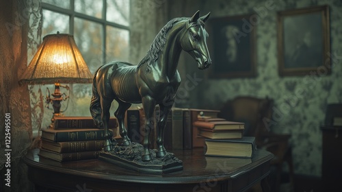horse, sculpture, bronze, vintage, table, book, interior, elegant, classic, decor, lighting, indoor, art, piece, detail, still life, antique, atmosphere, shadow, craftsmanship, home, design, interior design, statue, equine, decoration, library, study, heritage, ornate, furniture, ambience, nature, equestrian, artistry, tradition, culture, material, luxury, history, timeless, artistic