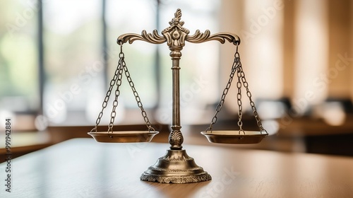 Bronze legal scales on a judge's desk in a courtroom
